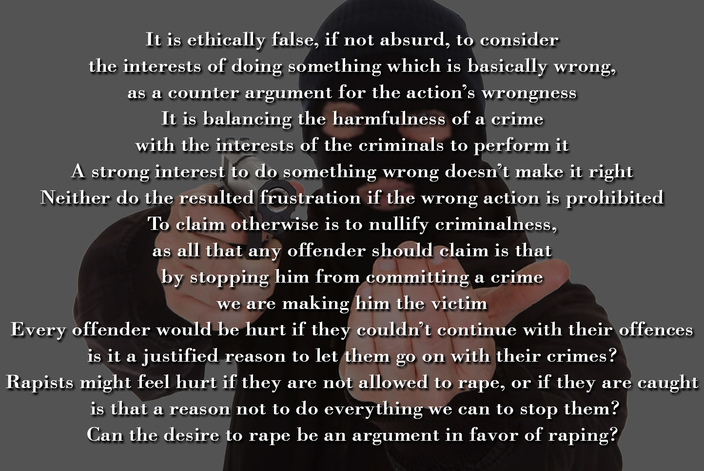 Rapists might feel hurt if they are not allowed to rape, or if they are caught, is that a reason not to do everything we can to stop them? Can the desire to rape be an argument in favor of raping?